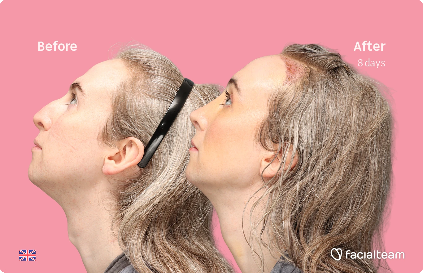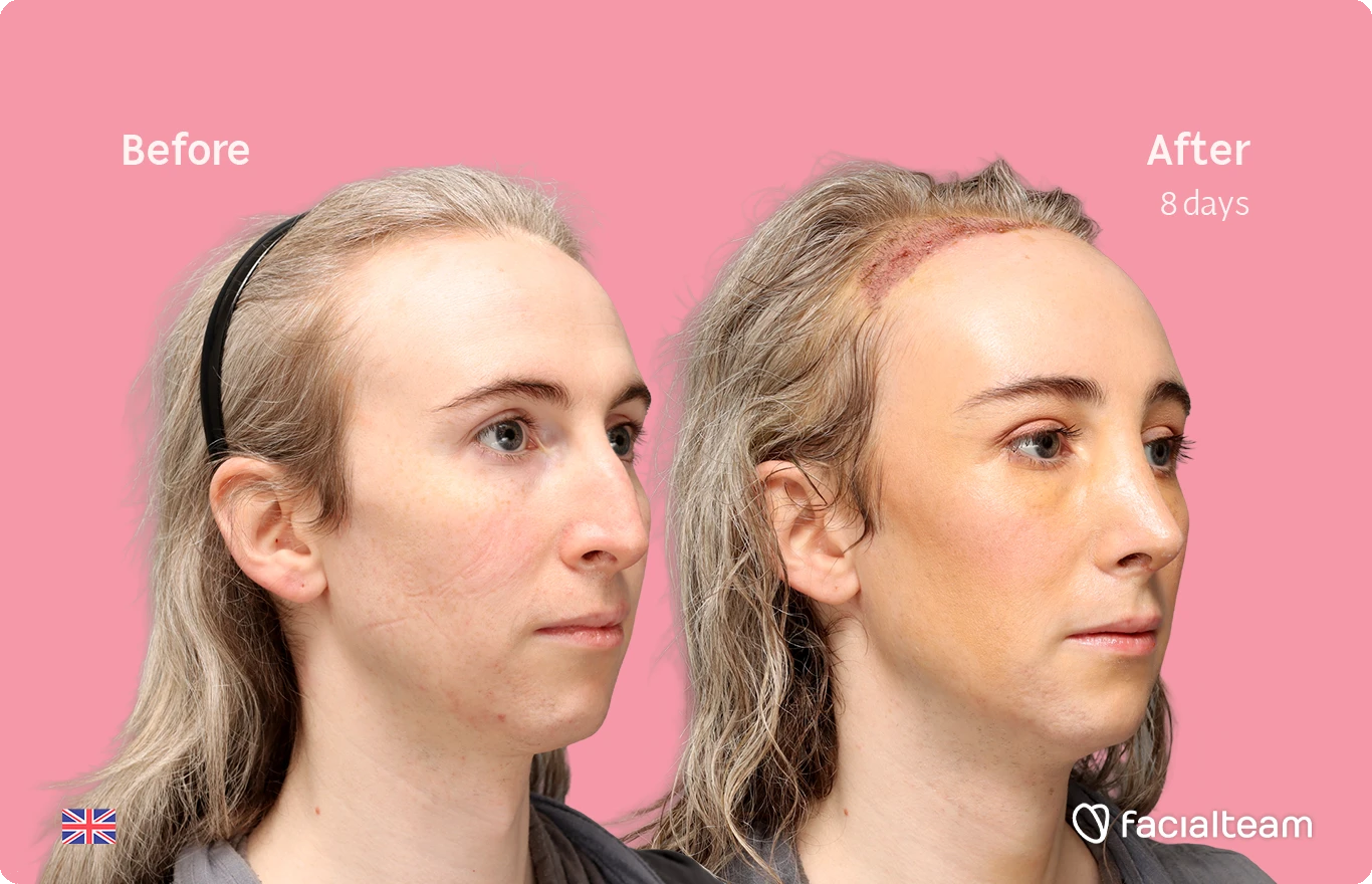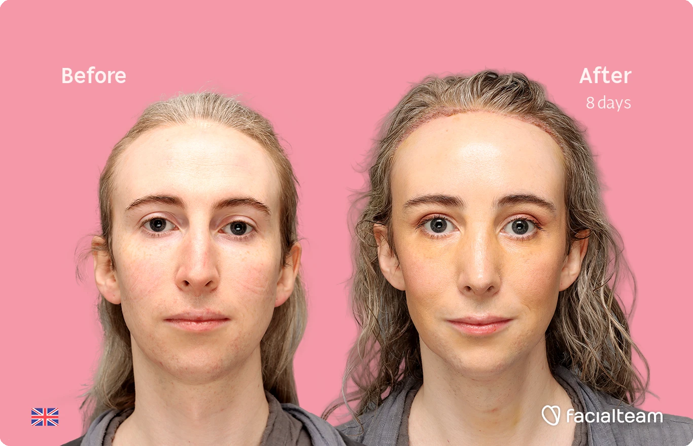 Hayley C., eine 32-jährige Frau aus dem Vereinigten Königreich, unterzog sich bei Facialteam in Marbella einer Gesichtsfeminisierungsoperation, darunter Stirnfeminisierung mit gleichzeitiger Haartransplantation (SHT), Rhinoplastik und Reduktion des Adamsapfels. Die Vorher-nachher-Bilder, die nur acht Tage nach der Operation aufgenommen wurden, zeigen die frühe Phase ihrer Transformation. Obwohl noch Schwellungen vorhanden sind, wirken ihre Gesichtszüge bereits weicher und verfeinert. Hayleys Fall zeigt, wie eine Kombination geschlechtsangleichender Eingriffe schon in den ersten Tagen der Heilung sichtbare und stärkende Veränderungen bewirken kann.